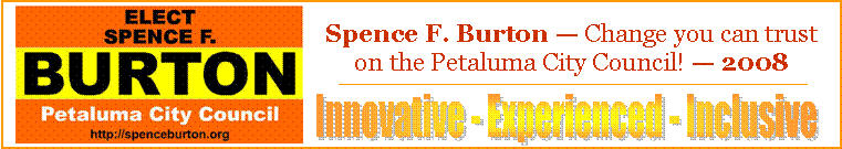 The Future is in Your Hands! We Must Do Better! · Will we continue to lose more parks than we gain? · Will our traffic just keep getting worse with more development compounding the problem? · Will we continue to allow outside development money to “buy” local elections? · Do you want honest representatives who will make decisions based on what is BEST for Petaluma? I believe we all do! We have seen what this Council Majority, and some of their appointees on the Planning Commission and SPARC, can do to us, and Our City. Whether it is the unnecessary increase in our Garbage rates, due to the lack of action and extensive delays of the Council Majority in 2005, or the political gamesmanship of this same group who stripped Councilwoman Torliatt of most of her Committee appointments, etc.! We must elect responsive, honest individuals in November, those who put Petaluma First! Indeed the Future of Petaluma is at stake this year! Together we CAN MAKE A DIFFERENCE in making Petaluma an even Better Place for us and future generations to: live, work and play! Please join with me to reach everyone in Petaluma with our message for a Better Petaluma!